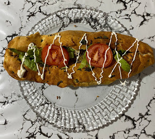 11. Fırından çıkan sandviçin ortası kesilir ve üzerine marul ile domates koyulur. Dilerseniz başka malzemeler de ekleyebilirsiniz. Afiyet olsun 😊