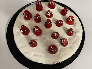 10. Çileklere kürdan yardımıyla göz yapmak için krem şanti sürülür ve üstüne damla çikolata yapıştırılır. Afiyet olsun 😊